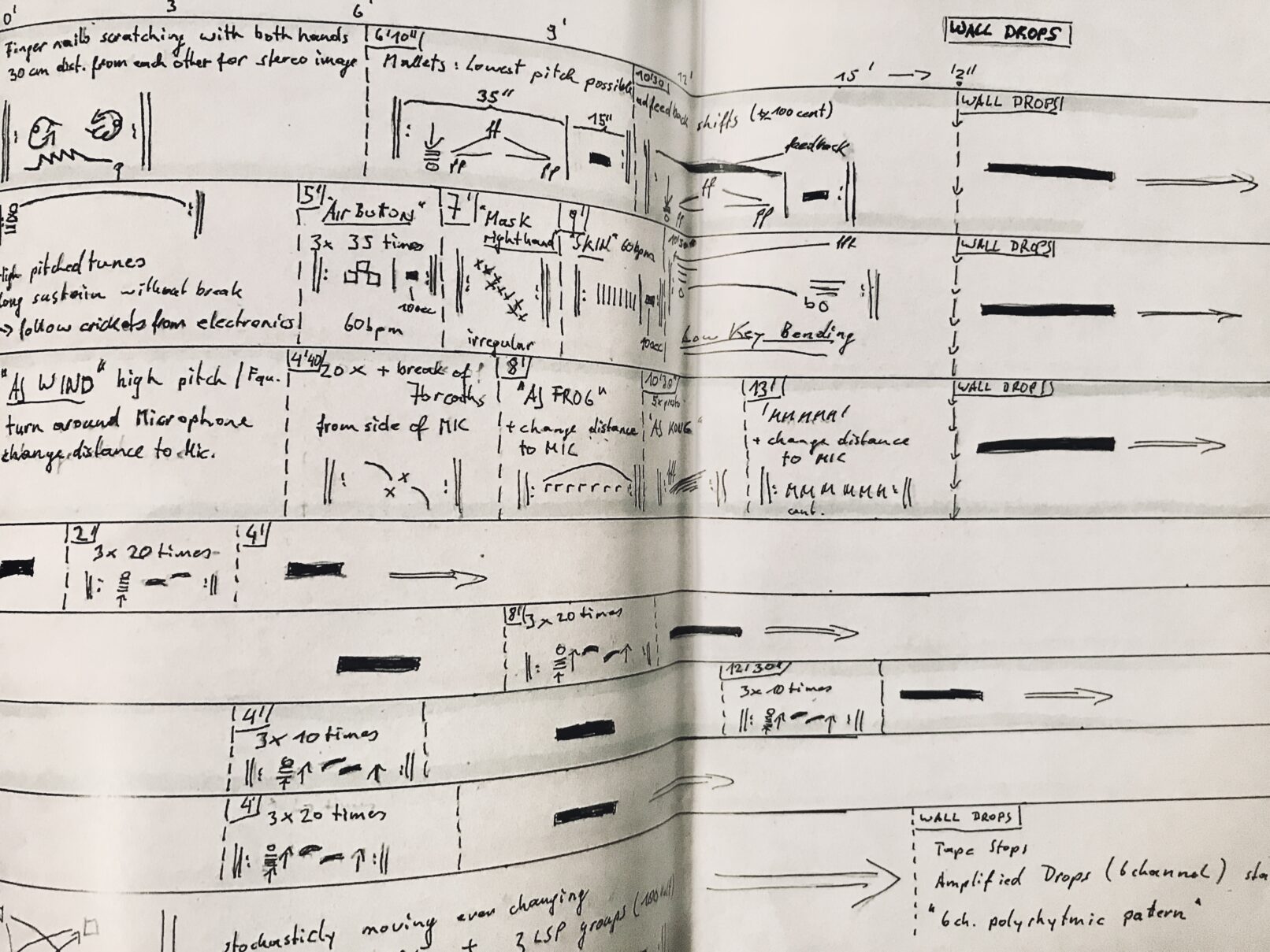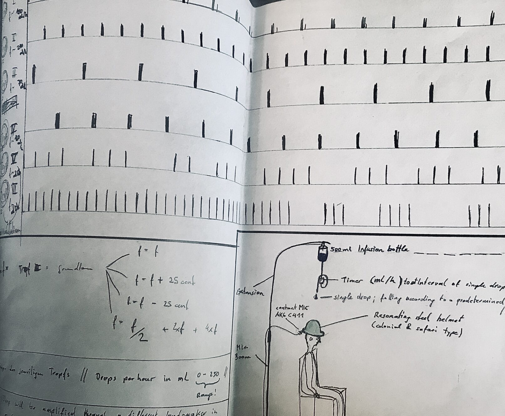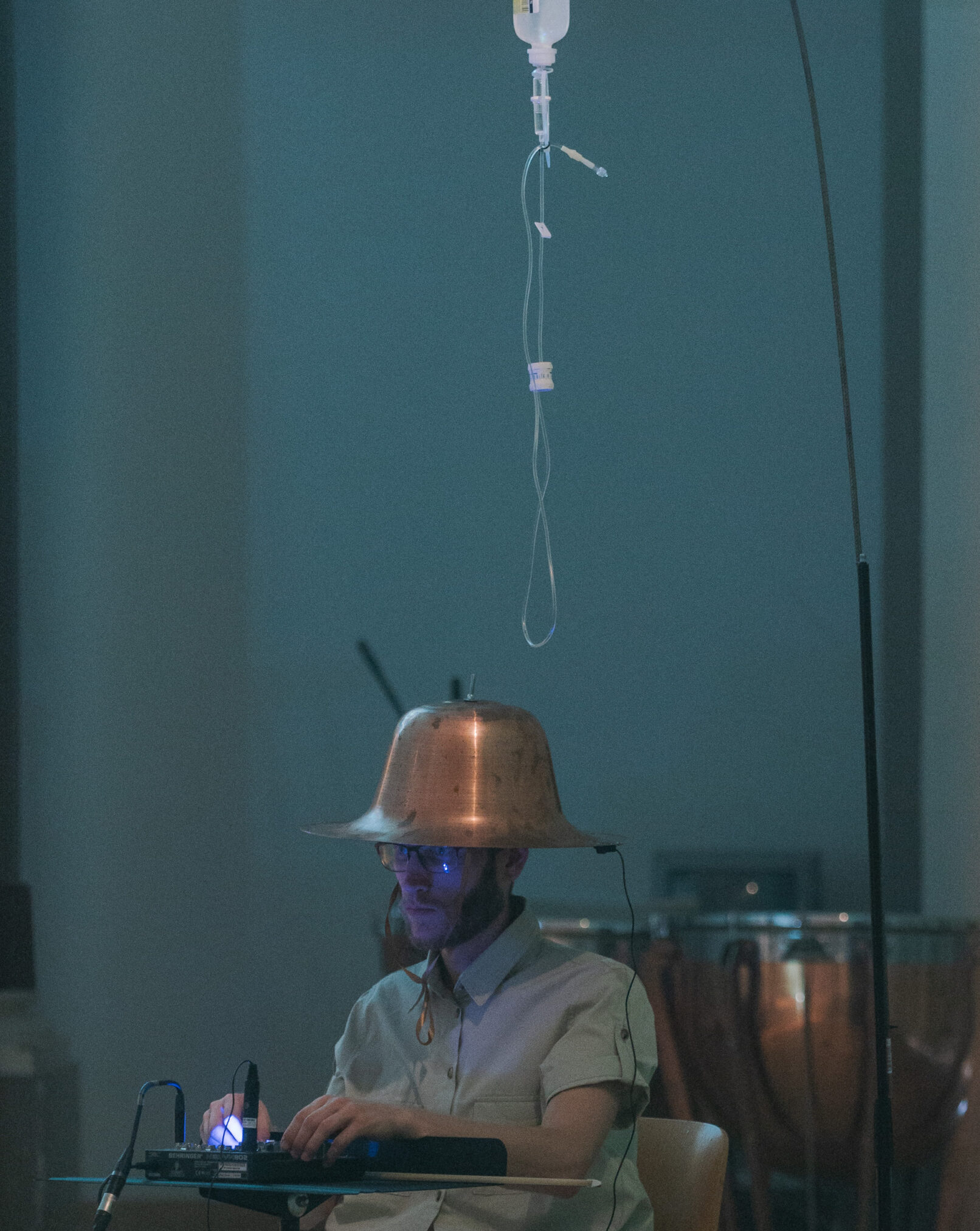 * water drops (polyrhythmicaly arranged via infusion bottels) on costum made colonial copper-helmets (spatially distributed / multi channel setup)